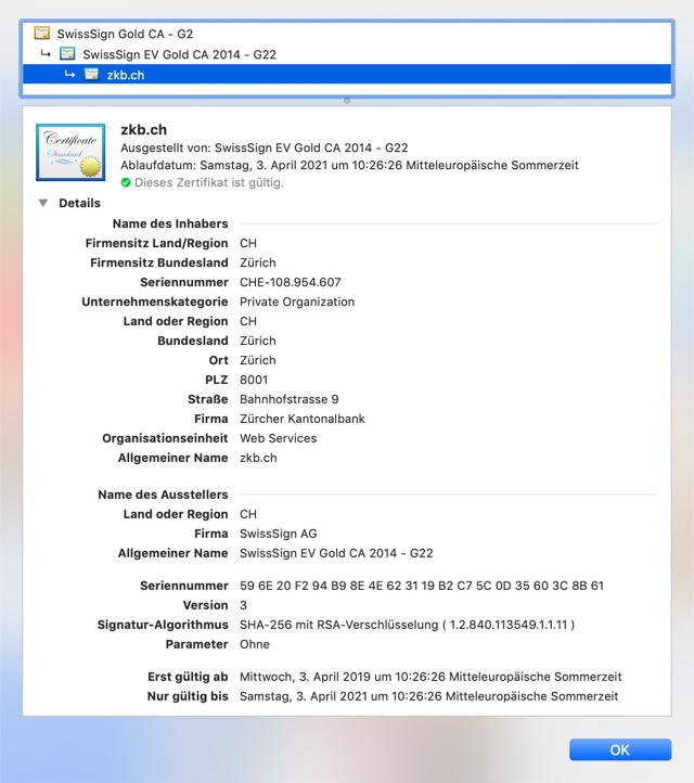 Hier bestätigt also die SwissSign AG, dass die Website zkb.ch der Firma ‘Zürcher Kantonalbank’ gehört, und dass der Server, mit dem ich derzeit verbunden bin, dieses Zertifikat besitzt: Der öffentliche Schlüssel, den diese https-Verbindung verwendet, wurde mit dem privaten Schlüssel von SwissSign signiert, was mein Browser wiederum mit dem öffentlichen Schlüssel von SwissSign prüfen kann (und er tut das auch jedesmal). Aber woher weiss ich, dass der öffentlich Schlüssel von SwissSign wirklich der SwissSign AG gehört? Ganz einfach: Der ist natürlich auch signiert. Von einer “höheren” Zertifizierungsstelle. Auf diese Weise kann man sich durch eine Kette von Zertifikaten (certificate chain) weiter hangeln, bis man ganz oben bei einem “root certificate” angelangt ist. Und diese root-certificates sind fest im Browser gespeichert, können einem also nicht von Bösewichtern untergejubelt werden. Natürlich ist diese Zertifikatskette trotzdem ein Schwachpunkt des Ganzen. Es wurde zum Beispiel bekannt, dass manche Browser Root-Zertifikate eingebaut hatten, die unter Kontrolle der NSA standen, so dass diese jede Verschlüsselung kompromittieren konnte, indem sie sich für irgendeinen Server ausgab und dessen Zertifikat mit der eigenen Zertifizierungsstelle signierte. Aber es ist immer noch die sicherste bekannte Möglichkeit, verschlüsselt und authentisiert zu kommunizieren.